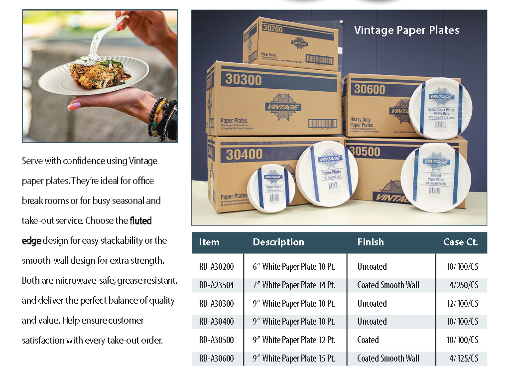 Serve with confidence using Vintage® paper plates. They’re ideal for office breakrooms or for busy seasonal and take-out service. Choose the fluted-edge design for easy stackability or the smooth-wall design for extra strength. Both are microwave-safe, grease-resistant, and deliver the perfect balance of quality and value. Help ensure customer satisfaction with every take-out order.